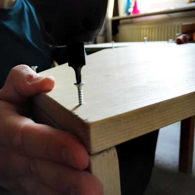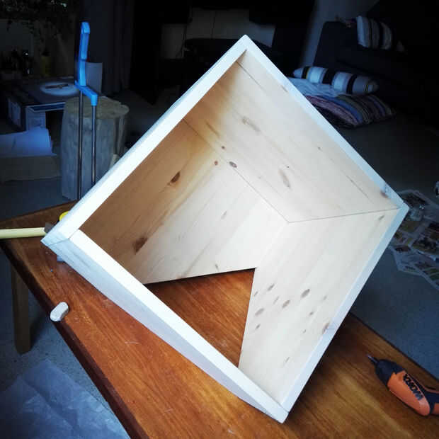 Una vez que todos los tornillos en su lugar, comenzar a construir. Es más fácil para Coloque las piezas en posición vertical sobre el piso o la mesa y las puntas ligeramente a través de meter los tornillos para alinear las dos piezas antes de atornillarlos parcialmente. Usted puede con cierto esfuerzo puntal les a un ángulo de 90 grados con su regla. Después de conseguir los lados viramos a uno otro, fijar la parte superior sobre la mesa boca abajo y voltear el cuadro en la parte superior y apriete los tornillos de arriba.