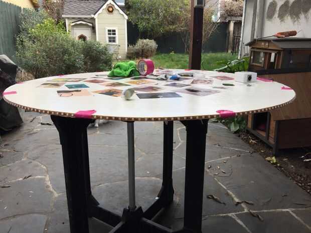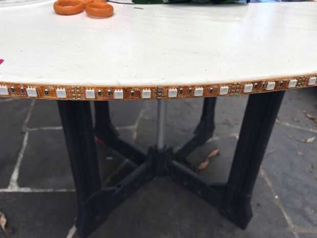 Tuve un carrete extra de 16 pies de tiras de LED RGB tirada por ahí y utilizar claro del silicón RTV para adherir las tiras de LED en la parte de la madera. Temporalmente con cinta las tiras para mantener las cosas en su lugar antes de que la silicona seca.