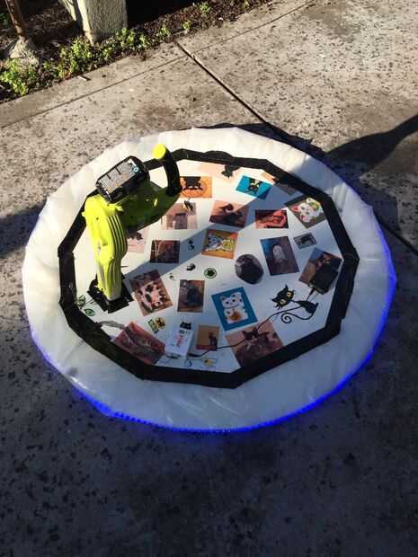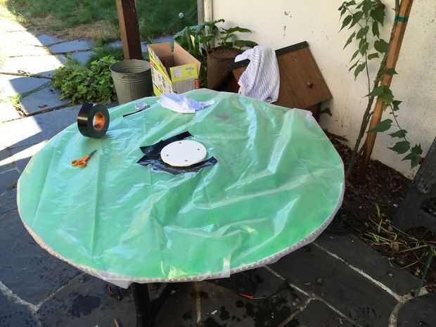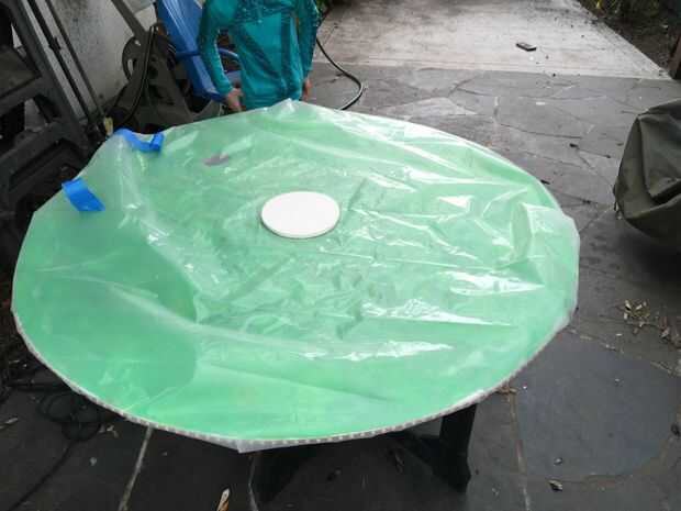 Por último añadir la falda de su aerodeslizador. Se utilizaron 6 plástico mil forro disponible en tu tienda de hogar. Hay una ciencia entera detrás del diseño de aerodeslizador falda por lo que no estamos seguros si esto es la más óptima pero le dices que funcionó muy bien. Cortar un círculo de envoltura plástica que cubra el círculo de madera con un extra de 8 pulgadas y entonces había unido dejar holgura de aproximadamente 3 pulgadas de 5 pulgadas. Usted no quiere que sea súper apretado.