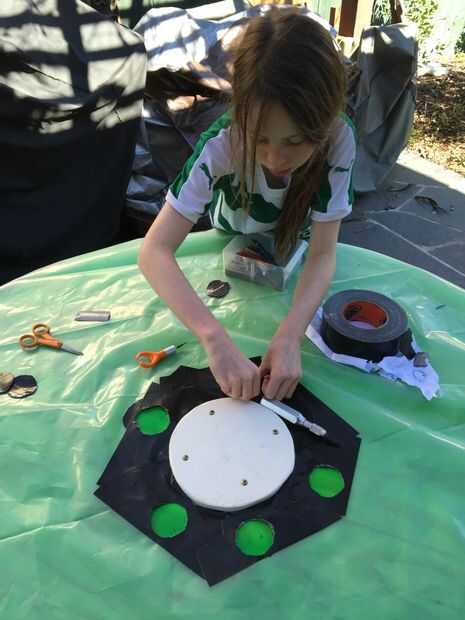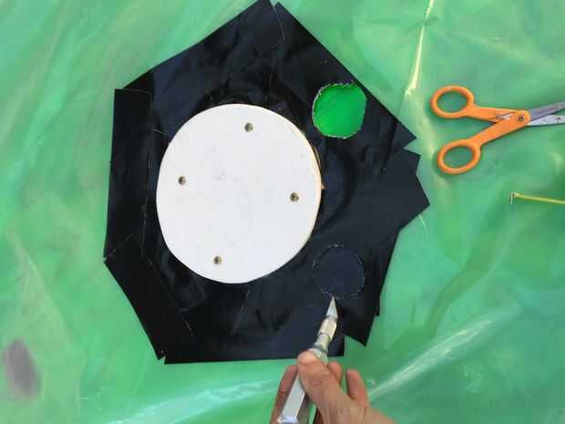 Por último, añadir algunos más cinta adhesiva alrededor de la pieza de círculo de centro y cortan los 6 agujeros de 1 pulgada de diámetro con un cuchillo. Tener la cinta del conducto con los 6 agujeros evitará que ripeo.