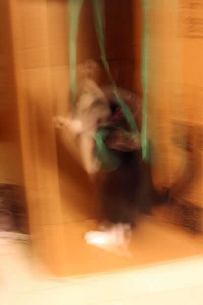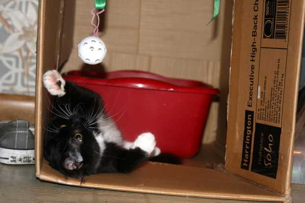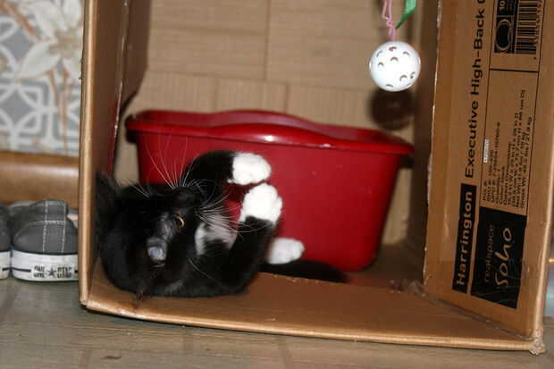 Una sala de juego perfecto para un gatito joven es una caja de cartón. Y barato también!