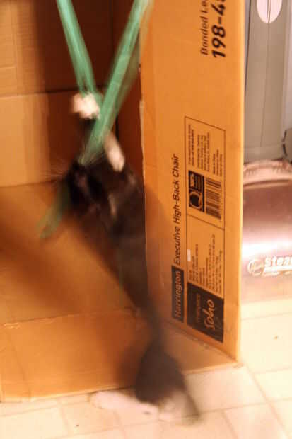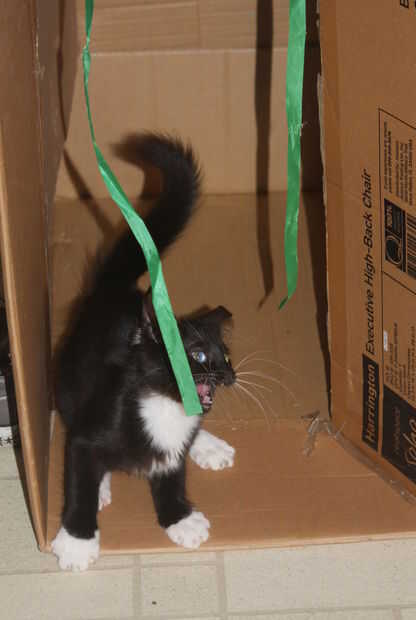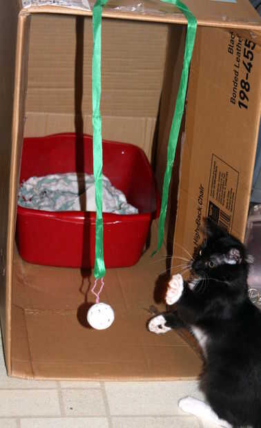 Aquí está nuestro gatito Bridget (llamada esto como le rescatamos en un puente) con su juguete du jour una gran caja de cartón con una cinta con grapas sobre ella y una bola de wiffle grapada a la cinta. Ella muerde, rasguña y jugar para el contenido de su corazón!