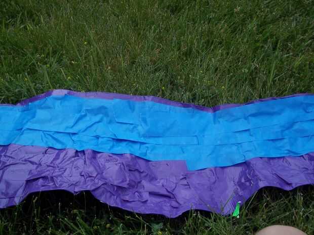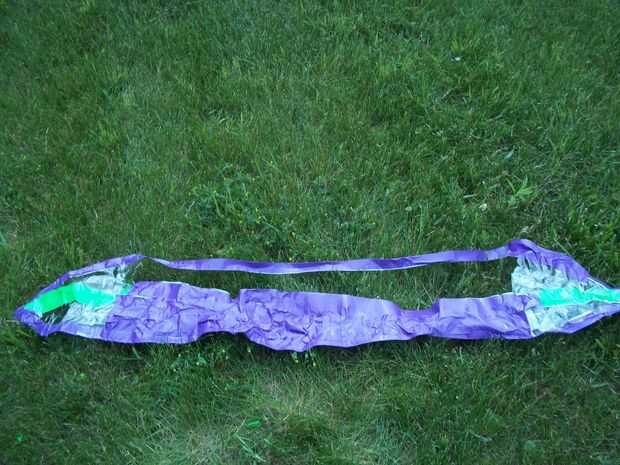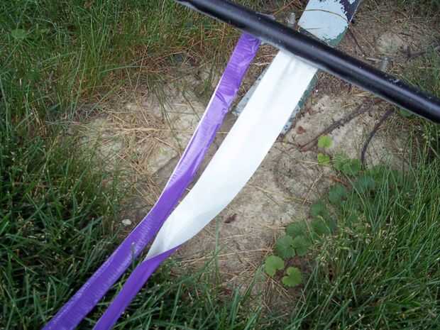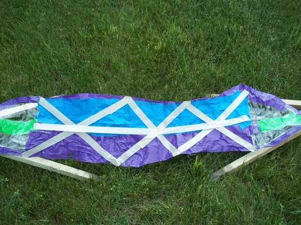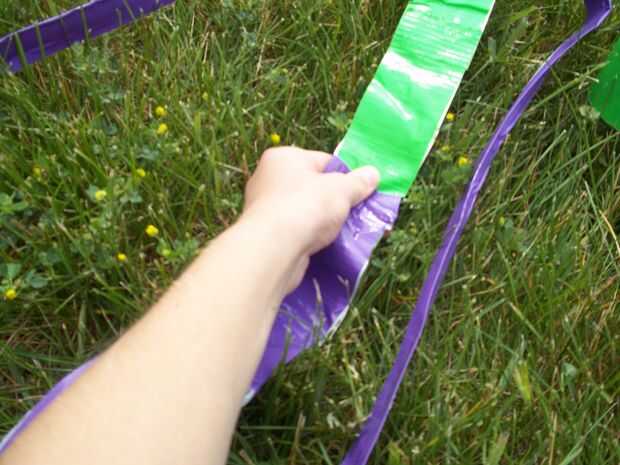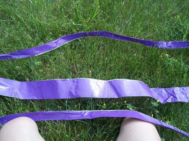 Para poner la parte de cinta de conducto de la hamaca en, cortar un agujero en la punta de la esquina de la cinta del conducto, tome la cadena y ponerlo a través del agujero, dos nudos en la cuerda Agárrate firmemente y enrolle la cadena alrededor de un conjunto de clavijas. Lo mismo al otro lado.