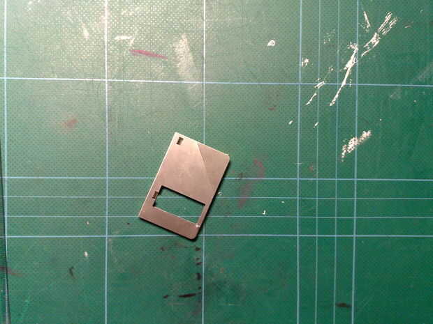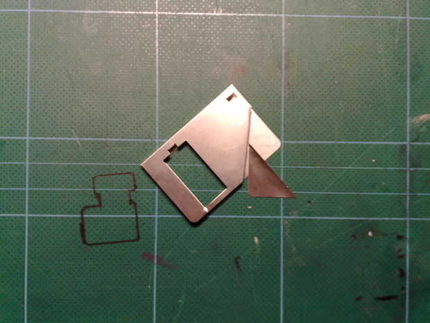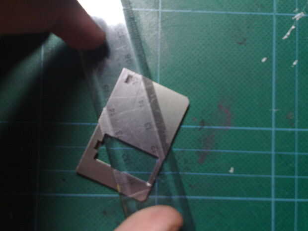 Ahora utilizando la regla y cuchillo vas a cortar un sesgo sobre la broca de metal rectangular. Usted probablemente no puede cortar a través de todo el camino, así que a lo largo de la curva corte el metal hacia adelante y hacia atrás hasta que encaje. (Las pinzas pellizcos son útiles aquí).