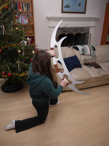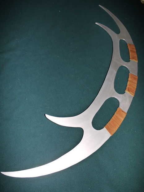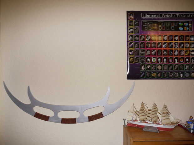 Mi hija de 12 años quería hacerla para Navidad un apoyo de espada Klingon de Star Trek bat'leth para colgar en su habitación. Asi que me hice una de madera contrachapada. Es realmente un proyecto muy sencillo. Los pasos básicos son: medir, hacer e imprimir una plantilla, cortar con sierra caladora, pintar con pintura metalizada, envuelva los mangos con cordón de cuero.