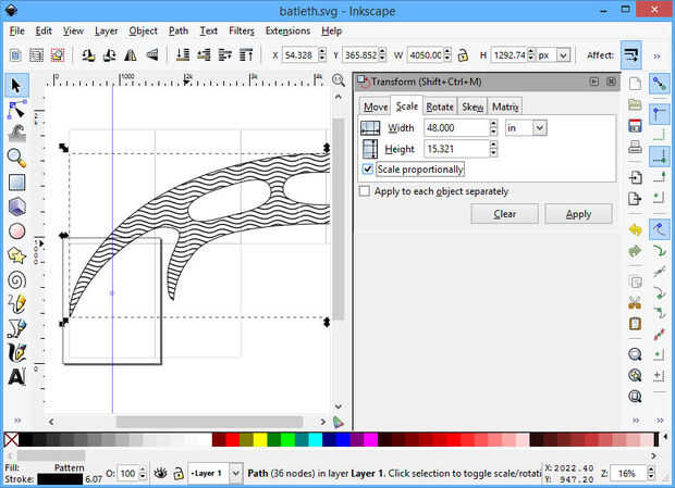 Aquí está el archivo svg de Inkscape para mi plantilla. Usted desea cambiar el tamaño de la bat'leth a sus dimensiones y quizá agregue más rectángulos de tamaño de página. Para cambiar el tamaño, carga la plantilla en Inkscape, haga clic en el bat'leth sí mismo, elegir objeto | Transformar | Escala de a través del menú. Haga clic en claro. Seleccionar en (o una unidad métrica, si lo prefiere) de la unidad desplegable. Asegúrese de que la escala proporcional está activada. Poner en el ancho deseado. Pulse aplicar. A continuación, seleccione el dibujo todo (ctrl-a) y cambia de puesto alrededor, impresión de una página a la vez (se puede ver en Inkscape que el área del dibujo se consigue imprimir), utilizando la rejilla como guía para asegurarse de que usted está recibiendo todo. (Puede agregar más rectángulos de la red, también).