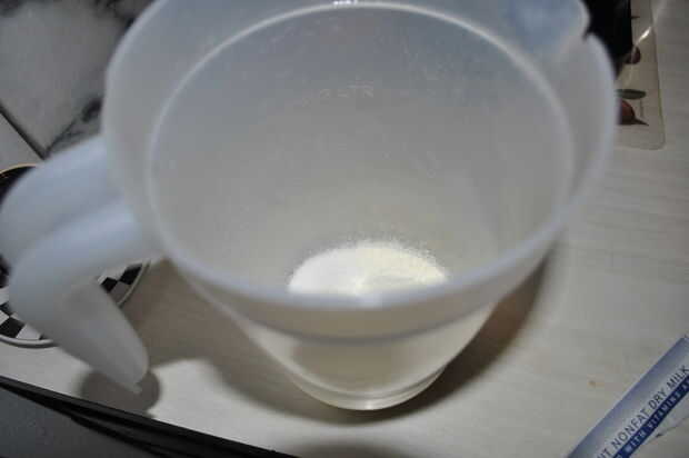 Agregar azúcar al gusto y 1/2 paquete leche en una jarra en polvo mientras está colando raktajino