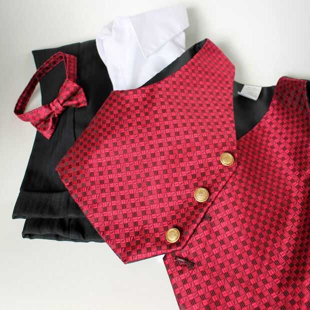 Nosotros tuvimos la suerte de encontrar un niño chaleco, pantalones, camisa y pajarita correspondiente por $3.99 en una tienda de segunda mano. Creo pretendía ser un elegante traje de Navidad, pero es perfecto para un traje de época de la fiebre del oro.