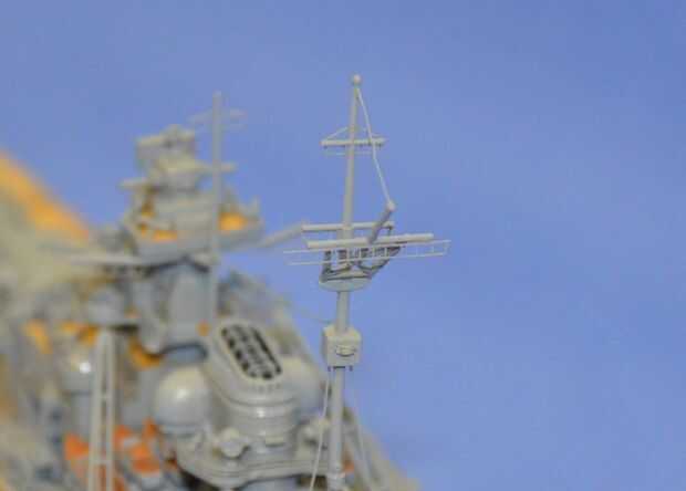 La navegación después estaba montada en la cara posterior del segundo mástil. Los cables de alimentación desde el LED pasa a través del bloque en el mástil y luego fueron utilizados como cables de guía de mástil pasando diagonalmente hasta la base en cada lado del hangar trasero y a través de la parte inferior para una placa de circuito impreso final. Fotos 15 y 16 muestran de LED montada en la superestructura y el segundo mástil.