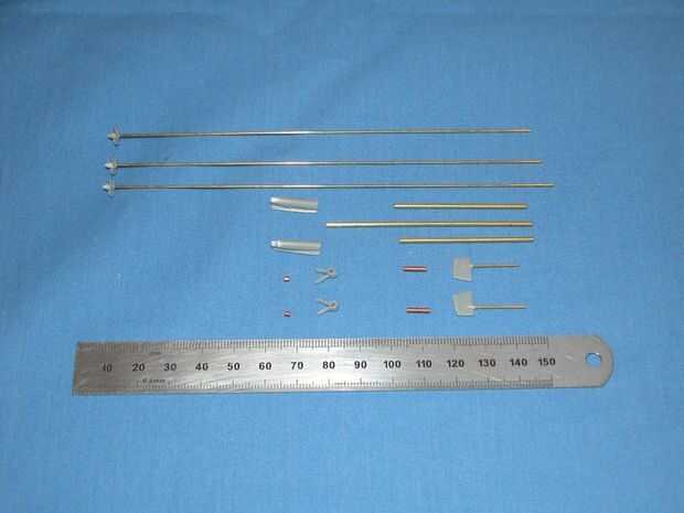 Los timones gemelos eran cada uno perforado y golpeado ligeramente 16BA y dos árboles pequeños hechos de varilla de latón de 0,8 mm con un hilo de 16BA cortan en cada extremo. Los tubos de entrada de timón se hicieron de tubo de cobre de 1,5 mm y dos brazos de pequeño cultivador de hoja de cobre amarillo. Los tres acoplamientos flexibles hicieron de pequeños tramos de tubo de silicona con casquillos de latón inserta y pegar en cada extremo. Todas estas partes se aprecia en las fotos 3 y 4, justo antes de su montaje en el casco.