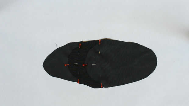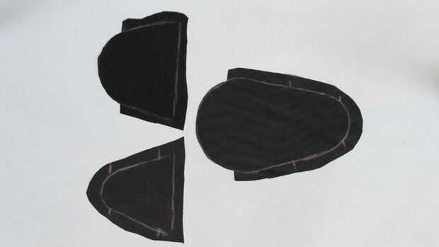 Ahora que tenemos todos los parches de tela, podemos empezar a coser. de conexión de ambos lados de la cubierta con los pernos (véase las fotos). Usar una puntada en zigzag para seguir las curvas y conectar los 3 de las piezas. Luego ponga dos parches con el interior hacia el exterior y conectarlas usando las clavijas, donde la plantilla dice una banda o cierres de sujetador viene, necesita colocar las bandas y cierres (tenga en cuenta la cubierta es adentro hacia fuera, por lo que las correas deben apuntar hacia adentro) y luego seguir el contorno con puntada recta. Deje un agujero para el relleno. el orificio debe estar ubicado entre las 2 tiras. fijar la cinta de velcro en los bordes del agujero y vuelva la tapa entera.