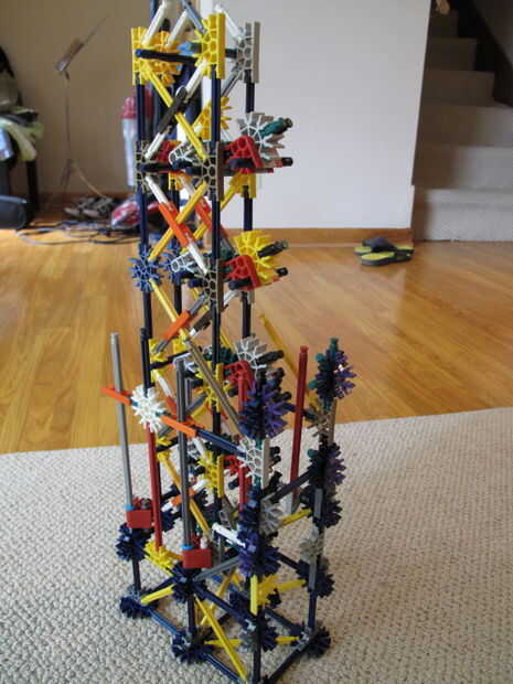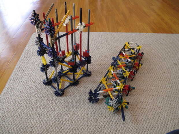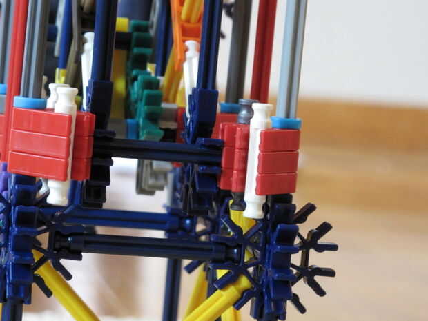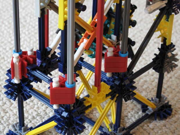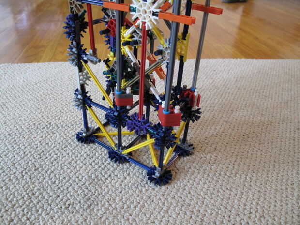 Ahora que el elevador y sus grabbers son completas, puede conectar a la base de la torre. Las barras azul sobresale en la parte inferior del dispositivo se conectarán a tríos de conectores rojo. Asegúrese de que las barras azules en el conector medio rojo! (La quinta foto muestra esto). El ascensor entero fracasará si no lo hacen. También, los captadores deben ser mirando hacia el frente.