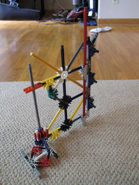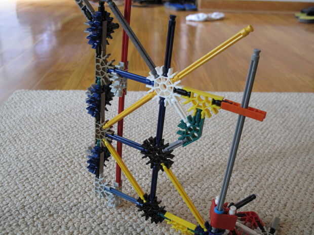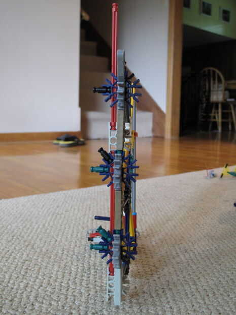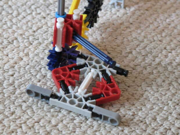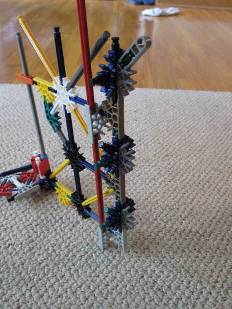 Aquí construirás parte 1 de la sección media de la torre. Va a ser en el lado derecho. La barra azul conectada al trío de conectores rojo también estará en el conector del medio.