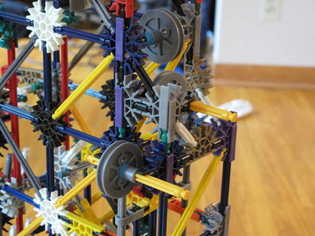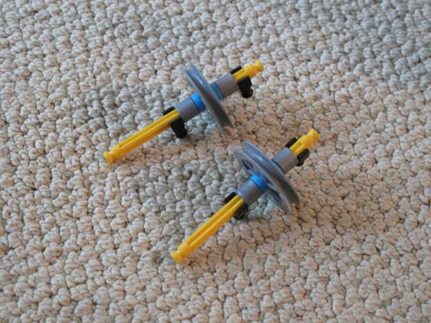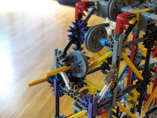 Son dos ruedas pequeñas que la cadena irá a través. Construcción y luego adjuntarlas a la espalda y la parte superior de la torre. Las barras amarillas deben sacar todo el camino hacia la parte posterior (imagen 3 muestra esto).