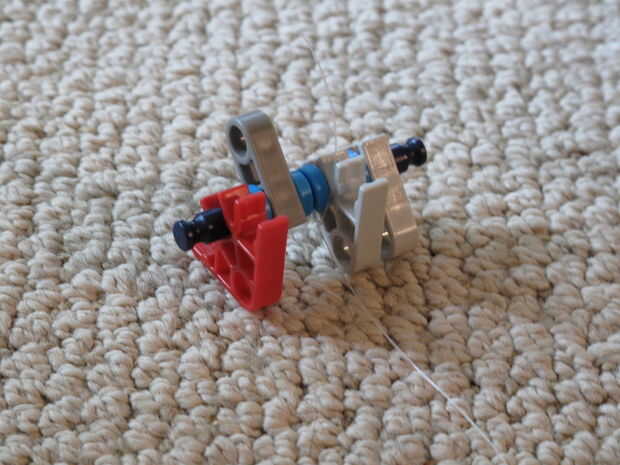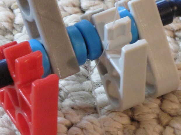 Obtener la cadena. Puede ser cualquier tipo, siempre y cuando no es elástico (yo usé sedal). Asegúrese de que tiene la misma longitud de lo que dice en la lista de piezas. Cuando se ate en la barra azul, ponerla entre los dos espaciadores azul. El otro extremo no debe estar atado a nada todavía.