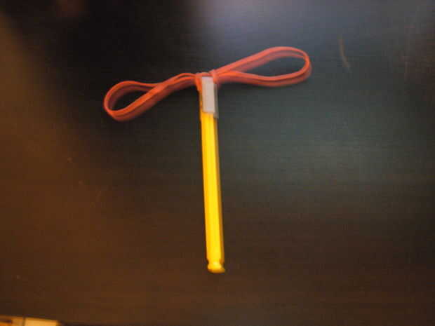 Conseguir una vara amarilla y el conector gris, acóplelos como se muestra a continuación. Consigue 2 de las bandas de goma, lazo a la pieza final gris con cualquier nudo que desee (usé cabeza de alondra, funciona!).