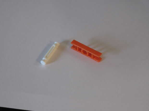 1. voltear boca abajo ambas secciones y combinarlos! Unen en 6 lugares, uno de que id en un conector morado. Sería más fácil primero gire los conectores amarillo 4 fuera del camino y simplemente coloque la barra azul al conector morado. Luego fije los conectores amarillo.