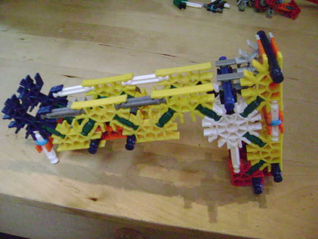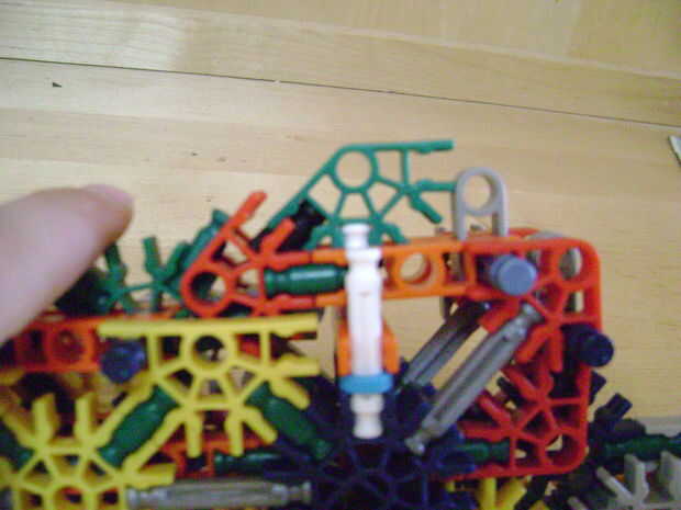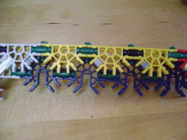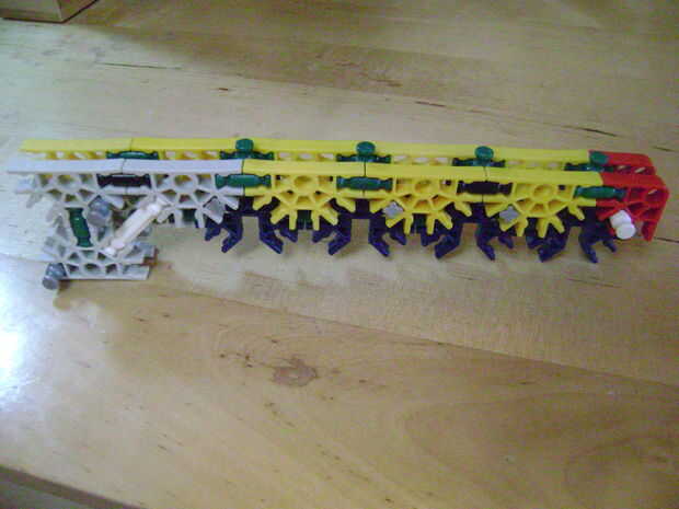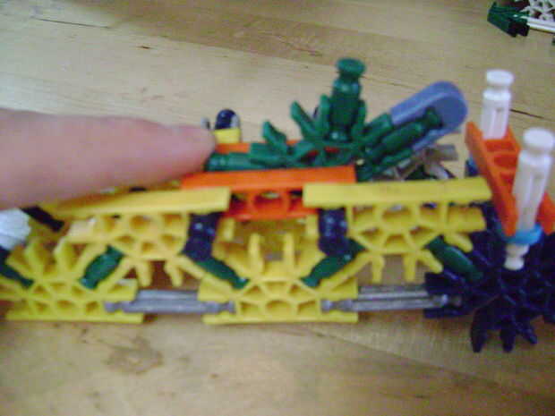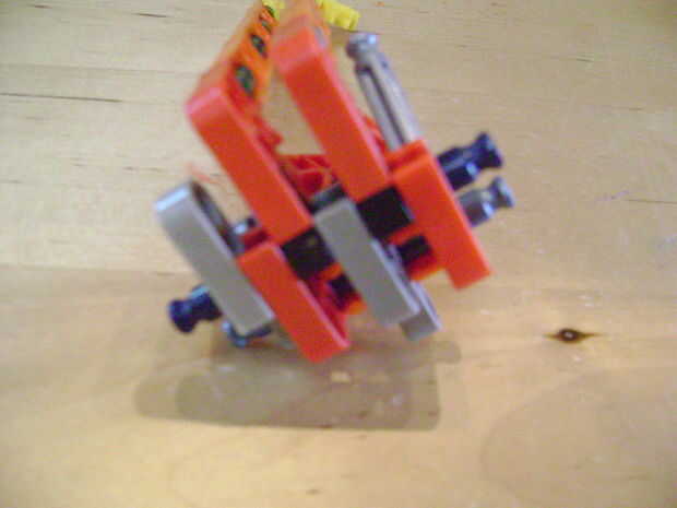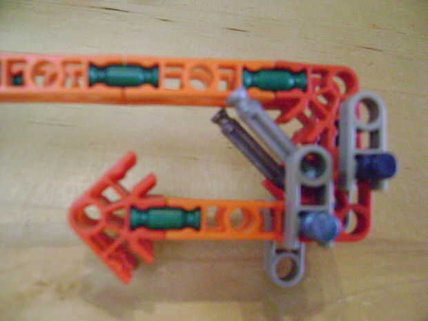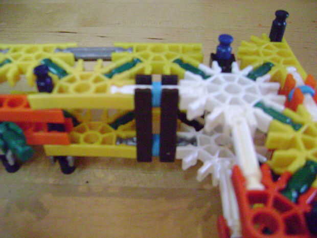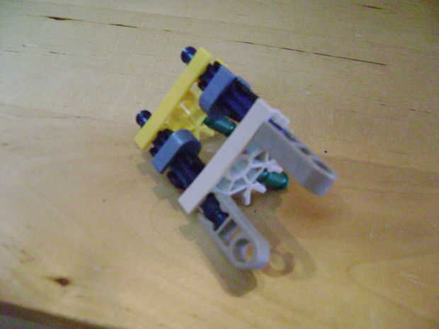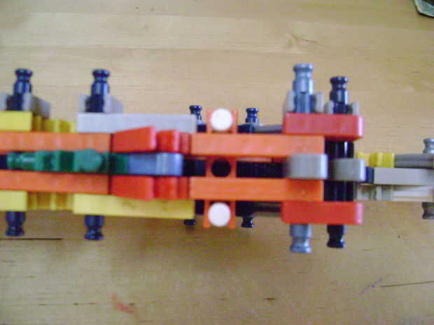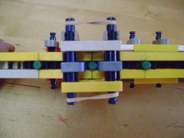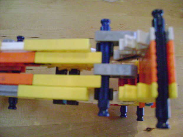 -Si se construye el final de la parte superior como yo lo hice, luego no bloquear en la posición completamente cerrada. Si se construye una conexión cuerpo diferente puede arreglar eso. Está bien como está, porque la mitad inferior empuja contra la barra blanca y el conector amarillo, por lo que no se romperá.