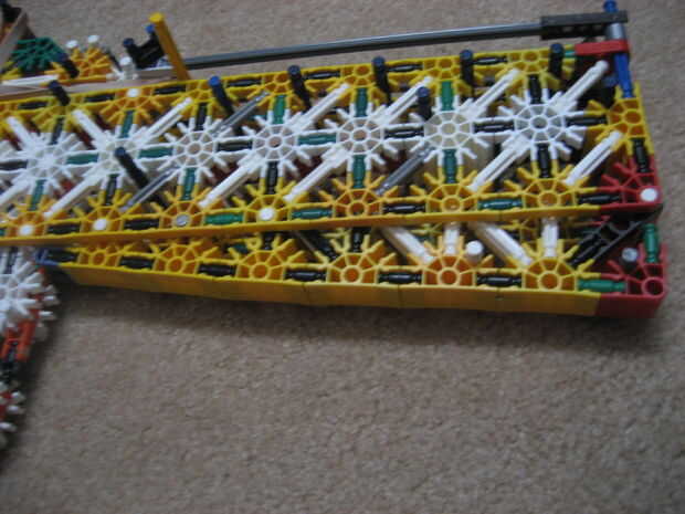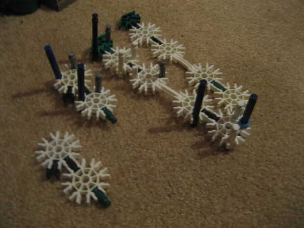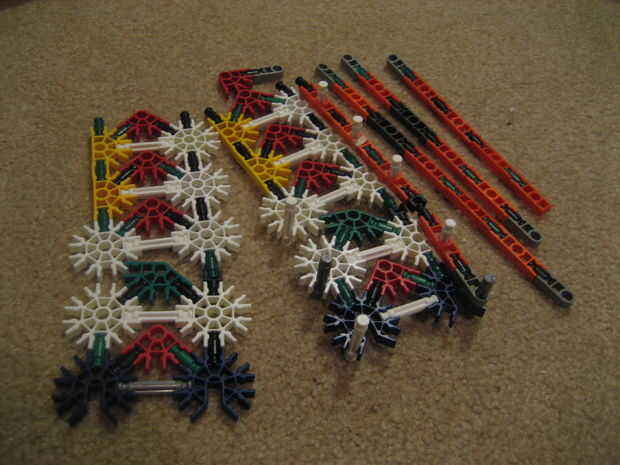 hi this is my old knex high mod jeep. su prety fácil de construir.Paso 1: partespiezas3 conectores y10 barras verdes15 barras blanco9 barras azul3 barras amarillas1 barra roja2 conectores gris6 conecters naranja17 conecters rojo10 conecters amarillo2