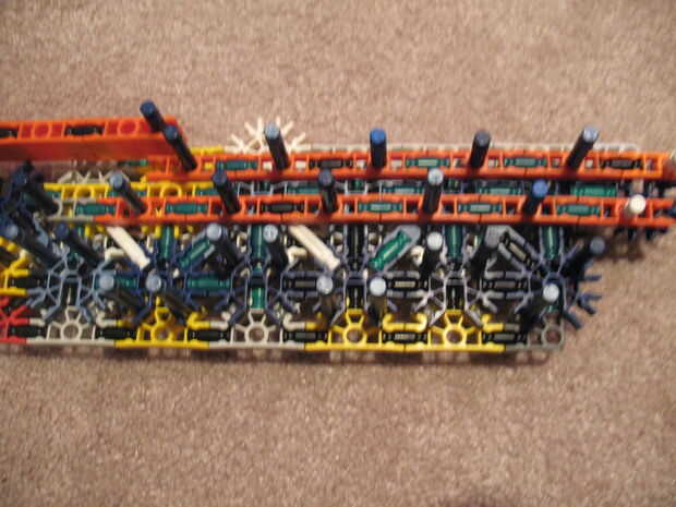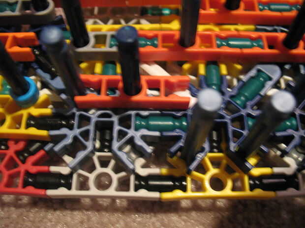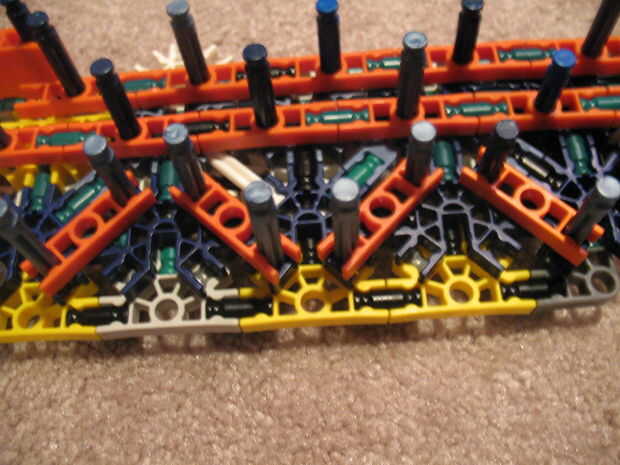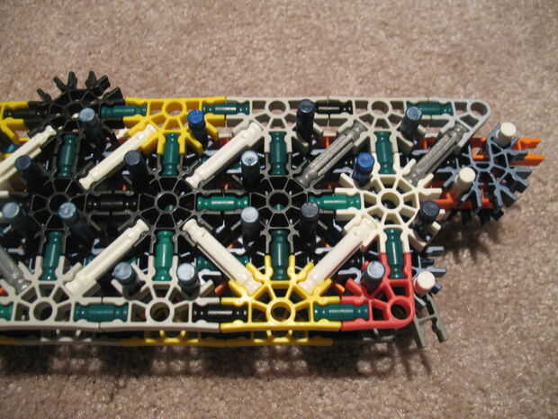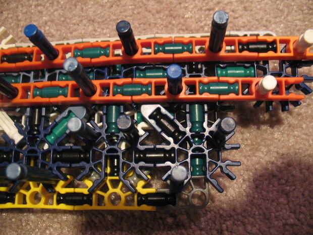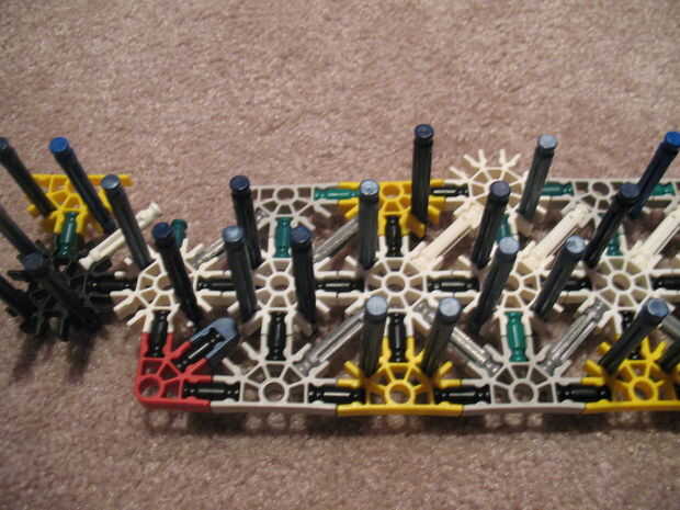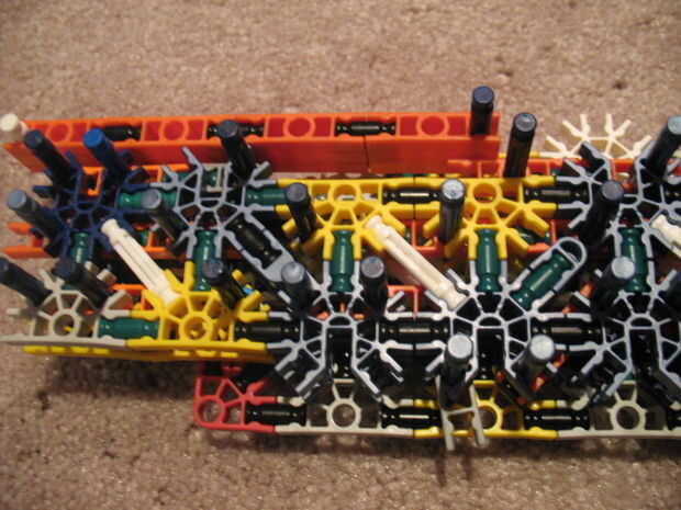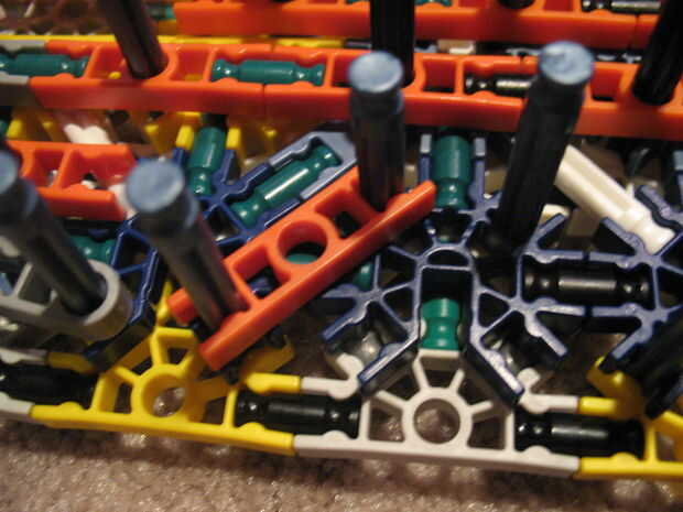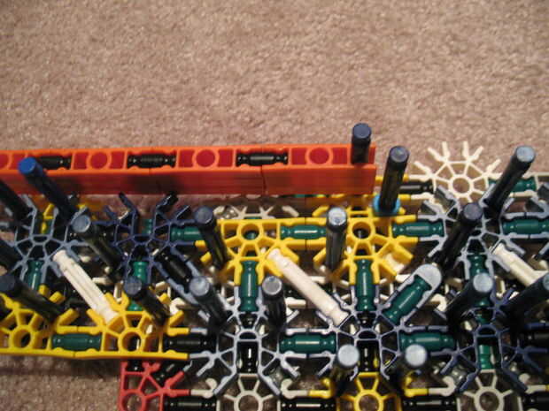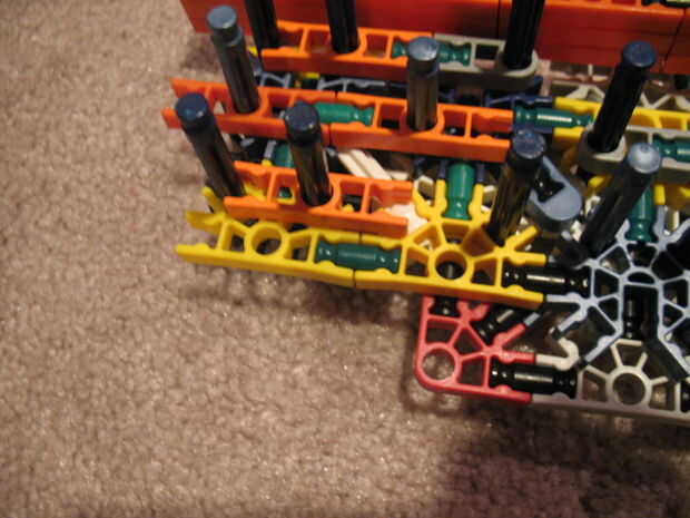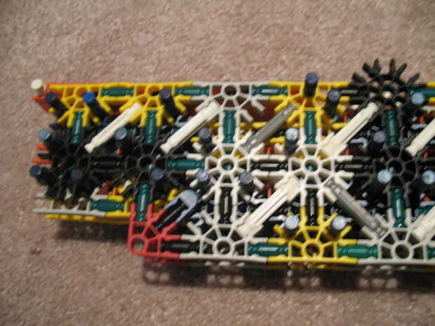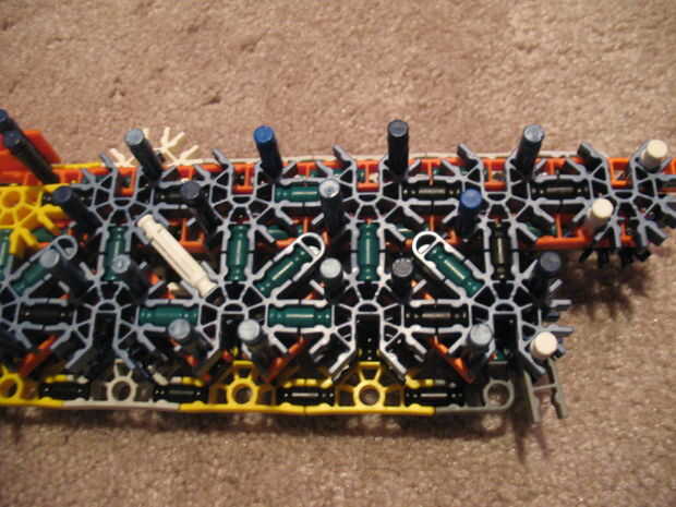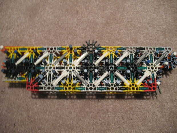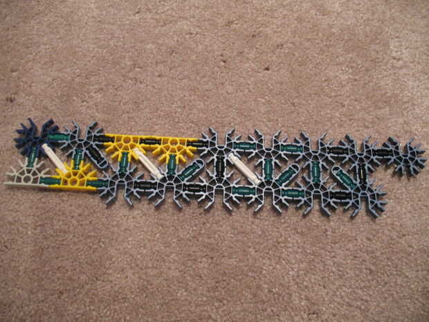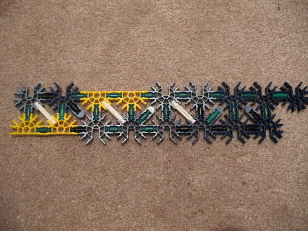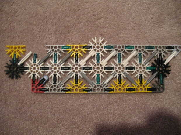 hi this is my old knex high mod jeep. su prety fácil de construir.Paso 1: partespiezas3 conectores y10 barras verdes15 barras blanco9 barras azul3 barras amarillas1 barra roja2 conectores gris6 conecters naranja17 conecters rojo10 conecters amarillo2