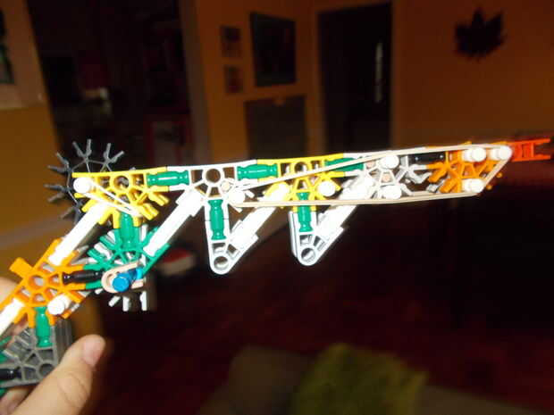 K'nex de una banda de caucho pistola con revista cargar sistema. Revistas pueden ser de muchas longitudes diferentes para propósitos diferentes. Aunque sean como barriles intercambiables, pedirá los compartimientos.Pros:-Semi-automatica-Compartimie