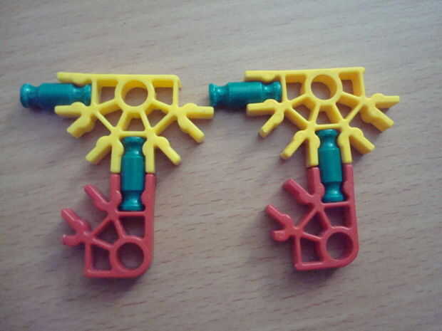 K'nex de una banda de caucho pistola con revista cargar sistema.  Revistas pueden ser de muchas longitudes diferentes para propósitos diferentes.  Aunque sean como barriles intercambiables, pedirá los compartimientos.Pros:-Semi-automatica-Compartimie