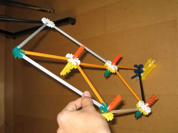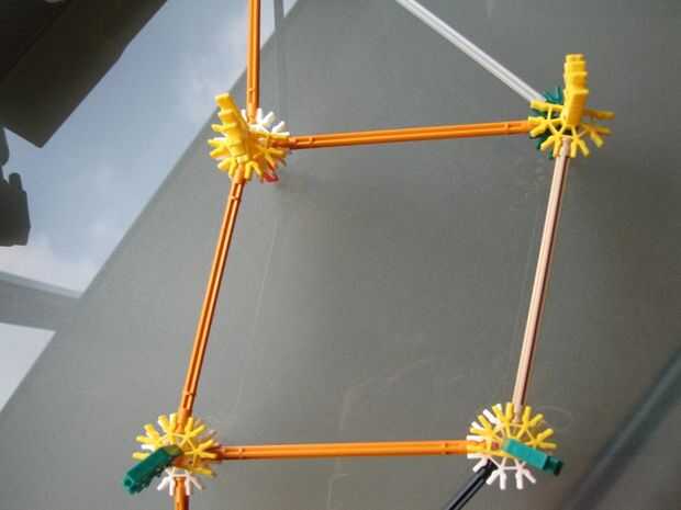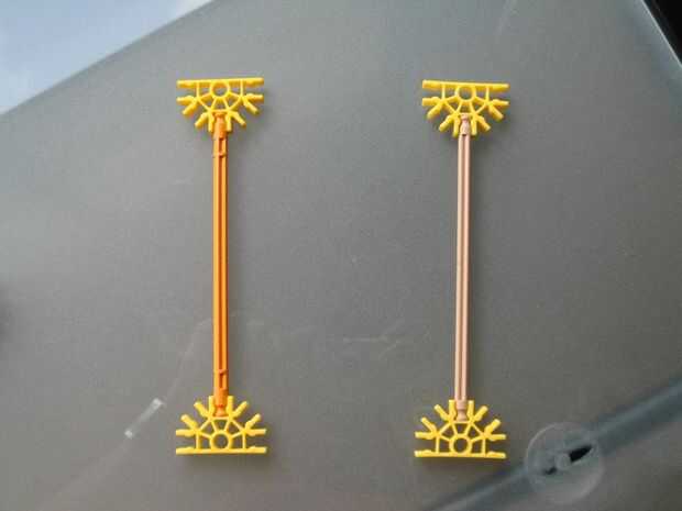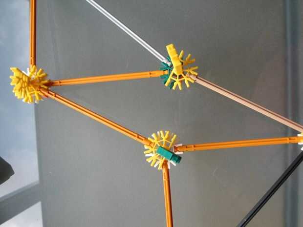 Construir los conectores y conectarlos entre el triángulo superior e inferior, este conectores ir encima de los triángulos y están Unidos por una varilla como se aprecia en las fotos. Las piezas amarillas y verdes en la segunda foto son sólo tapones para la varilla de conectarlos.