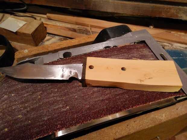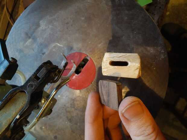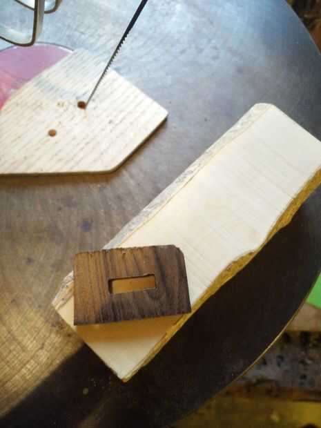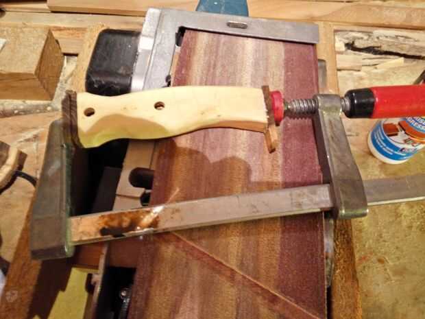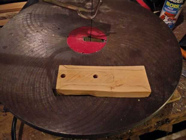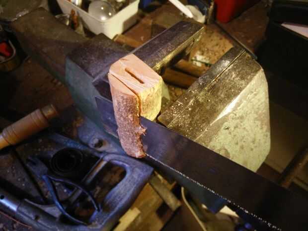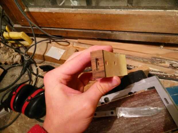 Luego marcó el lugar de los orificios de la espiga de la manija y perforar la madera. Pegué un trozo de madera en el extremo de la manija y uno en el otro extremo con una ranura para el tamaño de la espiga.