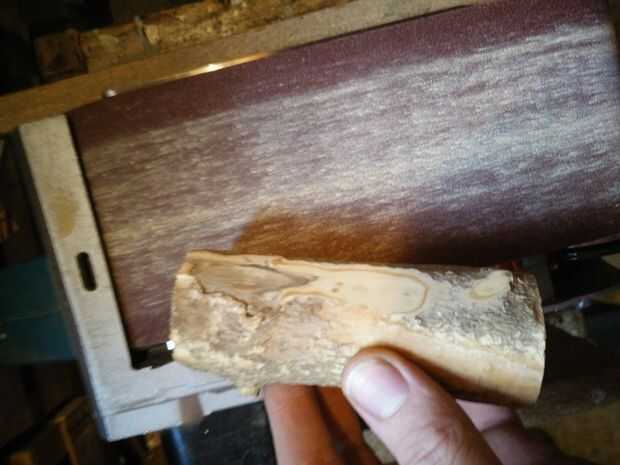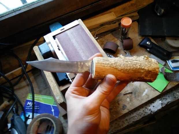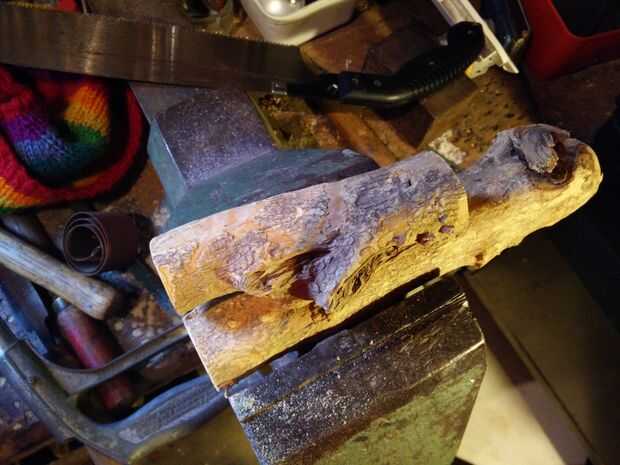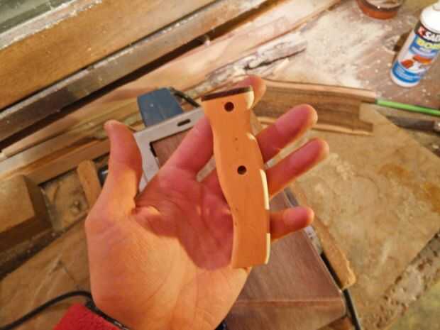 Dibujó la forma de la manija y recortar aproximadamente con la Sierra de calar y había redondeado en la lijadora de banda. Luego lo lija plan para terminar con una mezcla de aceite de parafina y hexano 1:1 (el hexano ayuda a la parafina penetre la madera y luego se evapora lentamente) y del grano de hasta 600 cuando consigo mis manos en algunas de las cosas.