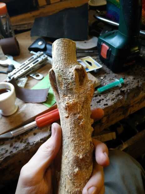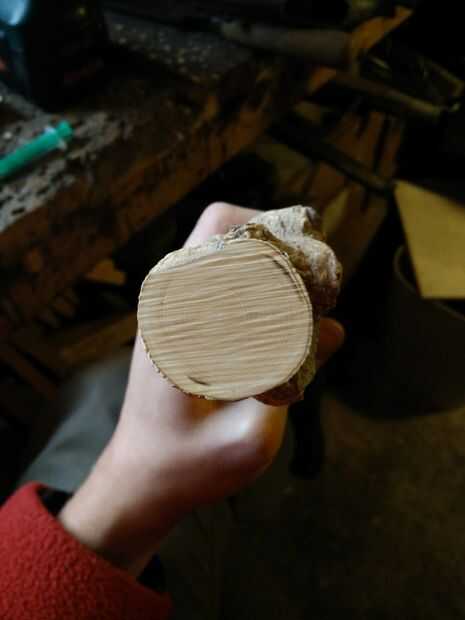 Utilicé dos maderas diferentes para obtener un contraste: la base de la manija se hace de madera de boj (Buxus sempervirens) y las puntas están hechas de una pieza desconocida de hermosa madera dura negro encontrada en el garaje de mi abuelo.