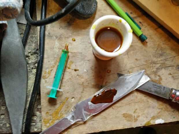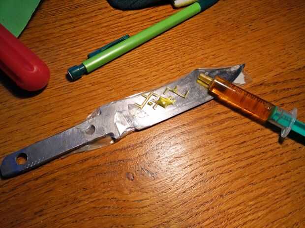 Hice una mascarilla con un poco de cinta y cortar el patrón en él. Luego depositó unos mililitros de la solución de FeCl3 y dejar reposar un par de horas. En retrospectiva, pude han concentrado la solución a la saturación y déjelo remojar durante la noche para grabar el patrón más profundo. Calefacción hará que la reacción más rápida a riesgo de agrietamientos de la cinta.