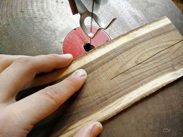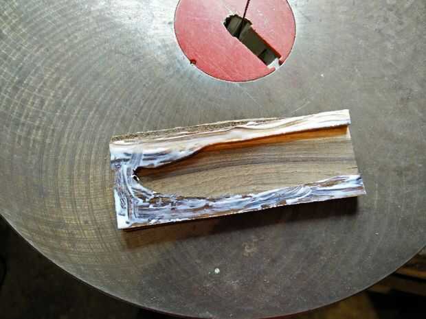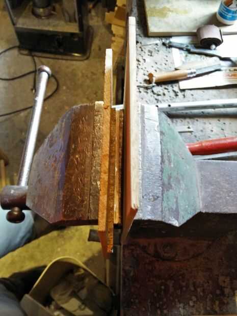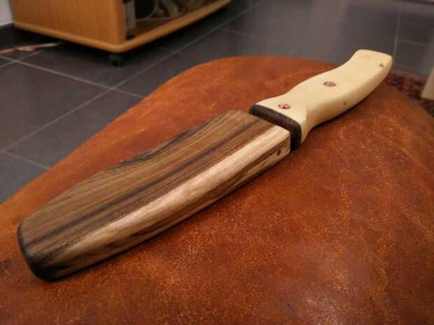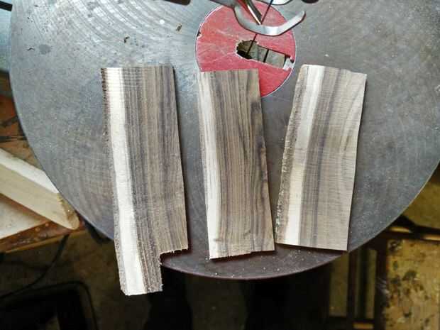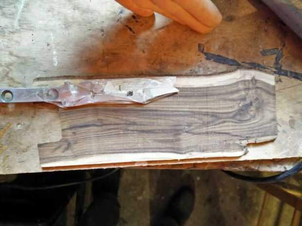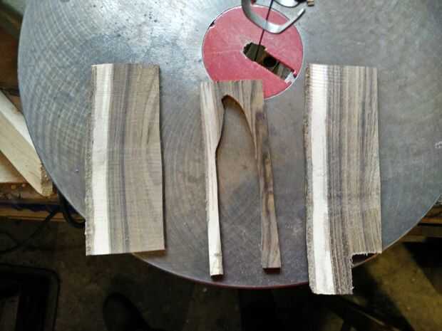 En uno de esos, corte la forma general de la hoja que podría deslizarse y ajustarse perfectamente. Me intercala que uno entre los dos otros con pegamento para madera, luego en forma de la vaina entera en la Sierra de calar y había redondeado en la lijadora de banda.