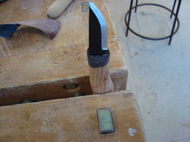 Mezcla de pegamento y llenarlo en el agujero con un clavo o algo similliar, por ejemplo. un palillo de dientes. Deslice la cuchilla en el agujero y dejar secar por unos 10 minutos luego retire el residuo de pegamento el cuerno. Finalmente la arena lo con el grano más fino una vez más para asegurarse.