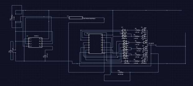 hice esto como un proyecto rápido usar mucho los LEDs tengo recientemente. Básicamente se conecta vía un 555 8 pin IC y permite ajustar el tiempo entre el tapajuntas cambiando los valores de resistencia o condensador. Proporciona un fresco buscando e