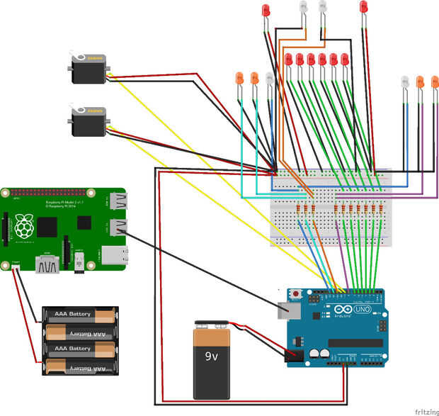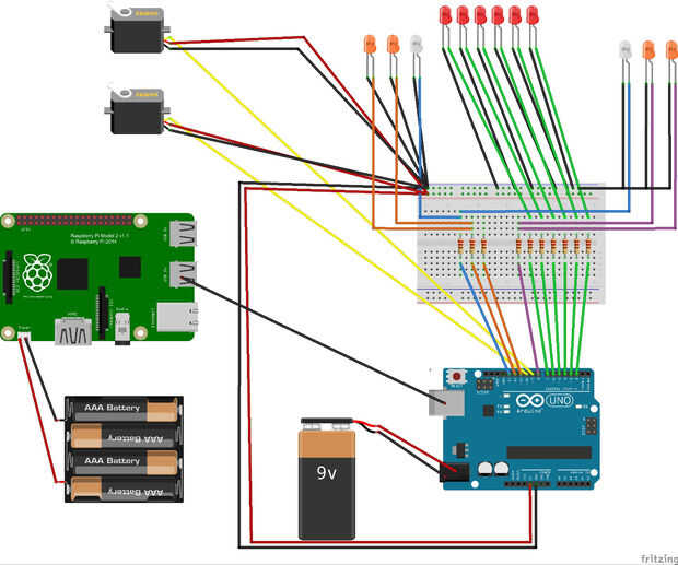 El Raspberry Pi y Arduino se conectan por USB. Hice un ejemplo de Fritzing e hice mi mejor esfuerzo para hacerlo lo más claro posible.