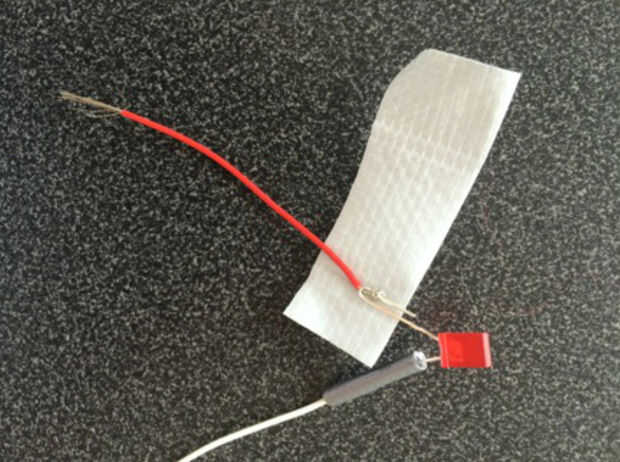 Ahora poner el cable rojo del registro en un trozo de cinta, poner la batería con el lado de plus en la parte superior, colocando el cable rojo corto desde la cima de op luz LED de la batería.