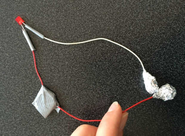 Ahora hace un par de zapatos para los alambres con papel de aluminio. Curva alrededor de las terminaciones de los cables para formar una pequeña bola, si conectas los pies, la luz debe trabajar.