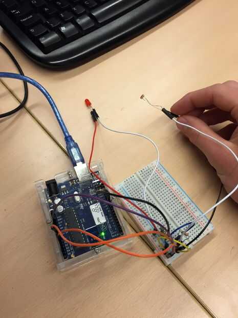 benodigdheden: arduino, LED, medidor, draden, LDR, batería de 9V, protoboard, moederdraden, knuffel en cinta