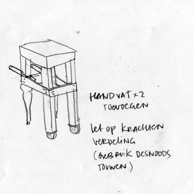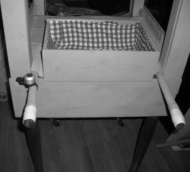 De staaf wordt op maat gezaagd en spijker ik gran aan de tafelpoten. De staaf moet je wel voorboren anders splijt dit gemakkelijk en dat wil je niet. De handvatten kun je mooi en zacht maken met pelusa de textiel en. (zie tekening) IK heb er een fietsbel aan gemaakt vasta.