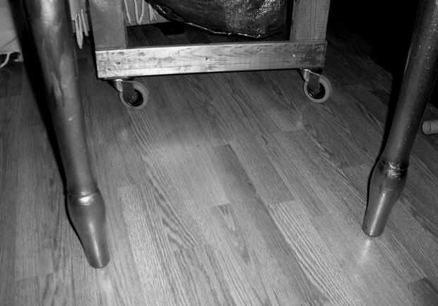 De andere 2 poten verleng ik op dezelfde manier, dan maar met dikke houten balken. IK zaag deze op maat (iets korter dan de tafelpoot i.v.m. de wieltjes) en schroef de 2 wieltjes er onder. (foto de zie)