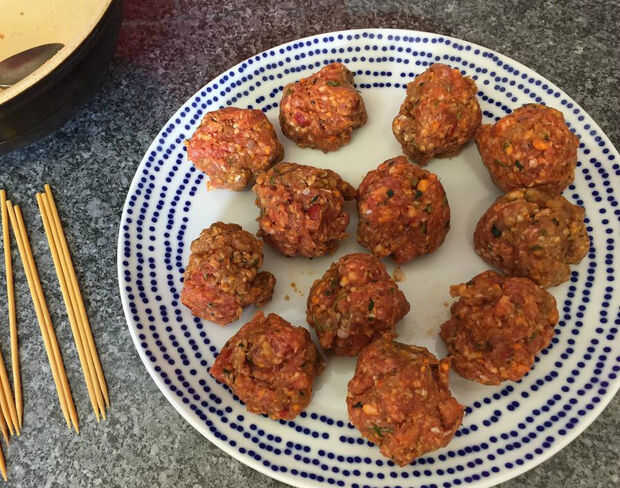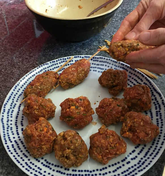 Dividir la mezcla en doce. Forma de óvalos - utilicé pinchos de bambú (remojados en agua) pero se pueden hacer formas salchicha o hamburguesa.