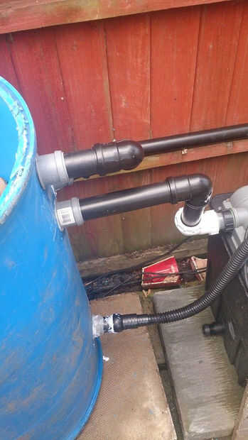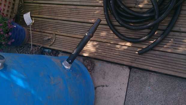 En la conexión más baja realizadas en el exterior del barril vas a para conectar la bomba. Ejecutar un tubo de 1 pulgada flexi desde mi bomba sumergible hasta los filtros, así que tuve que adaptar el tubo de entrada de 40 mm para acomodar un tubo de 1 pulgada flexi.