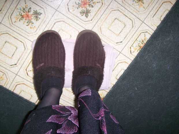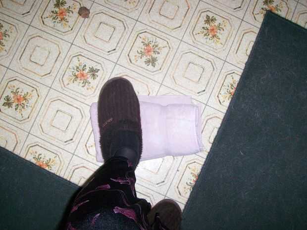 Súbase a la toalla con los dos pies y paso hacia adelante y hacia atrás hasta que la toalla es bastante aplanada.