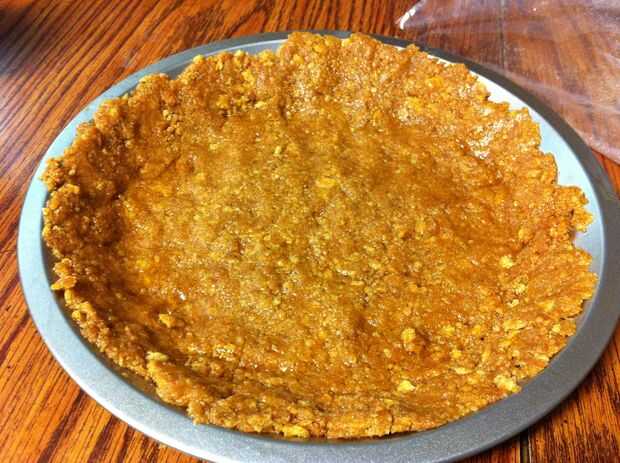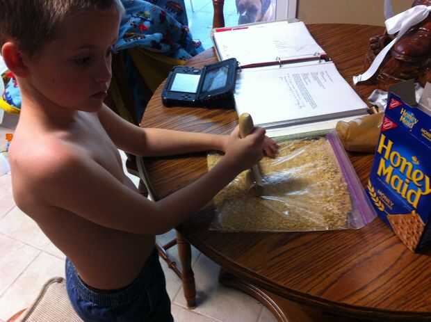 Aplastar las galletas finamente como usted puede conseguir. Mía puse en una bolsa ziplock y le dio a mi hijo para aplastar, tuvo una explosión. Luego mezcle 2 cucharadas de azúcar y 1/2 cubo de mantequilla derretida todos juntos. Luego romper en una tartera y colocar en la nevera.