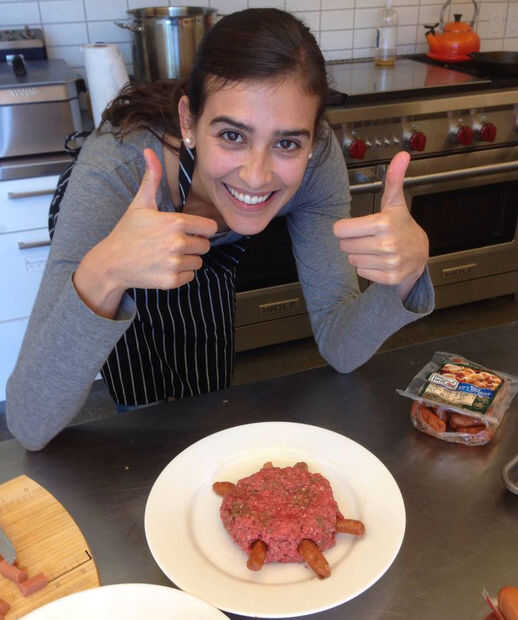 Hacer un pequeño agujero en la hamburguesa (con tu pinky, un palillo o el extremo posterior de una cuchara de madera) para cada pedazo de perro caliente y suavemente inserte la hamburguesa a cada miembro. Aplastar la hamburguesa en su lugar para apoyar las piezas de perro caliente y evitar el deslizamiento.