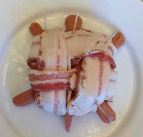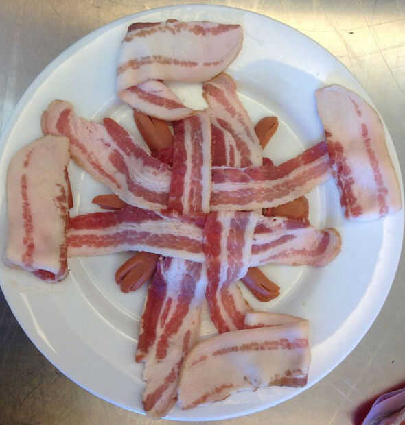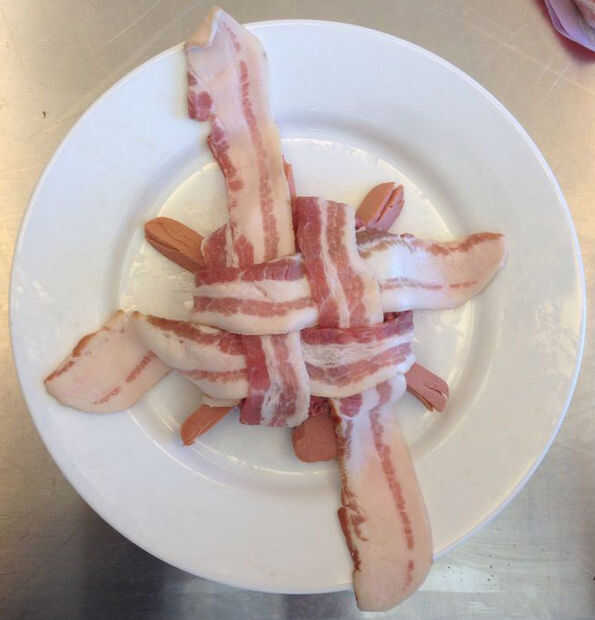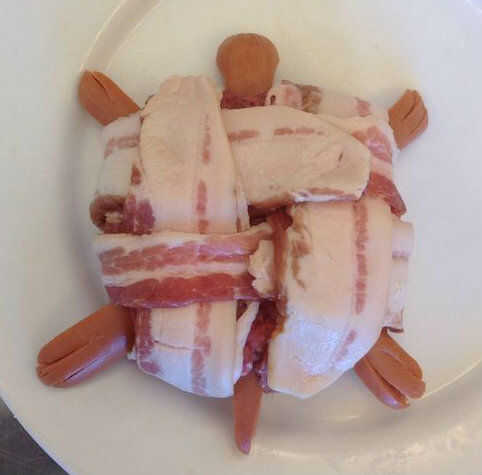 Organizar las cuatro rebanadas de tocino como se muestra en la foto primera de arriba. Tenga en cuenta que las rebanadas de tocino están dispuestas en una cuadrícula, con las piernas de tortuga asomando fuera de las cuatro esquinas y la cabeza de la cola sobresaliendo entre piezas paralelas. Se superponen láminas para comenzar el tejido de canasta, dejando un extremo largo y uno corto en direcciones opuestas.