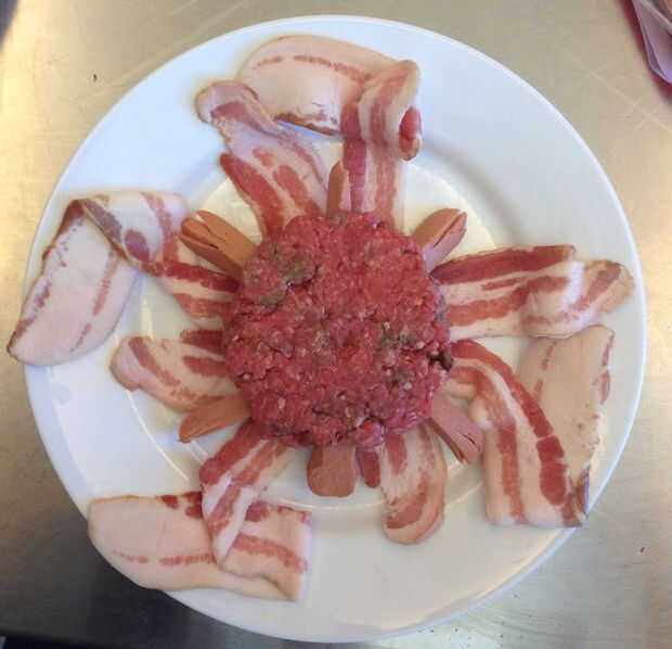 Pasar los extremos largos de la panceta encima de la hamburguesa y tejer como se muestra en la figura 3. Remeter los extremos cortos como apropiada para que coincida con la armadura de cesta.
