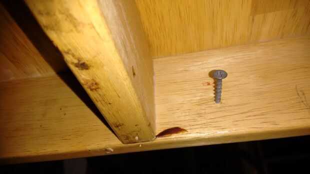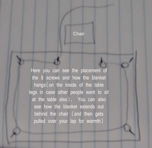 Por lo tanto, antes de ir mucho más necesita arrastrarse por debajo de la mesa con un taladro inalámbrico y unos 8 tornillos. Taladre un tornillo en cada esquina para empezar. Trate de hacer para que incline para arriba hacia la mesa. Esto puede ser difícil, si no funciona use un duro "algo" (una roca en mi caso) para empujarlos hacia arriba hacia la mesa cuando termines. Esto es para que no salgan la manta y los anillos.