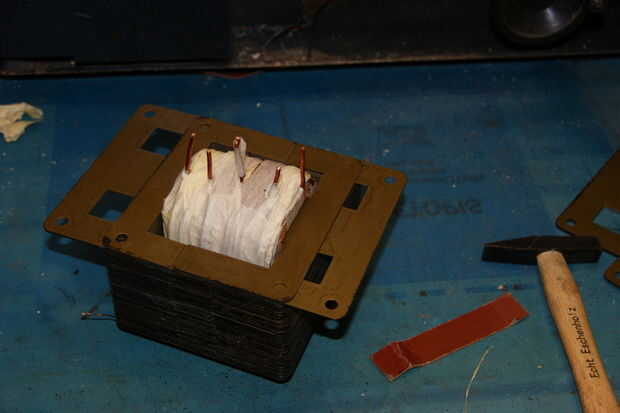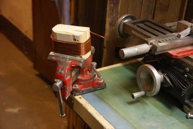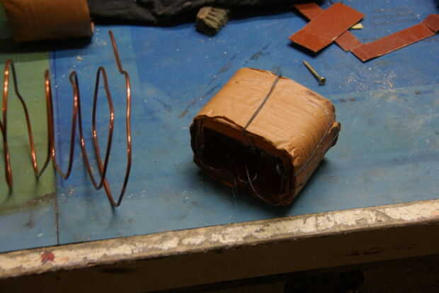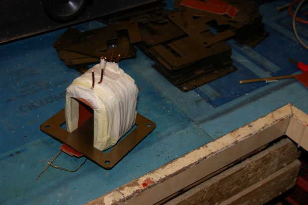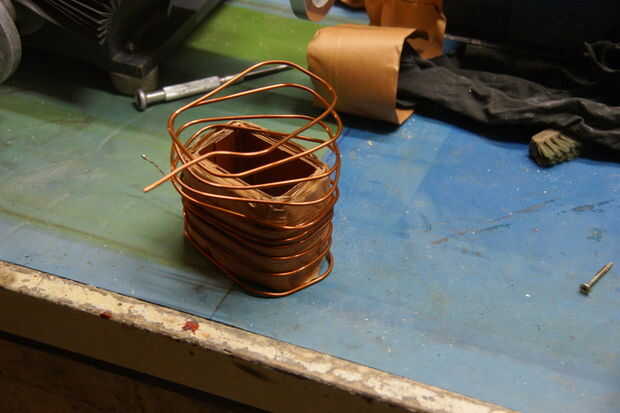 Hice un molde de madera para ayudar a sostener la vieja bobina primaria. Usando el viejo alambre de cobre secundario (3mm de diámetro) enrollé un doble paralelo de la bobina en la bobina primaria existente. Esto me dio acerca de 6V en lado secundario y prueba demostró que no era suficiente energía para fundir el alambre de acero de 1 mm. Además el transformador se convirtió muy caliente muy rápidamente.
