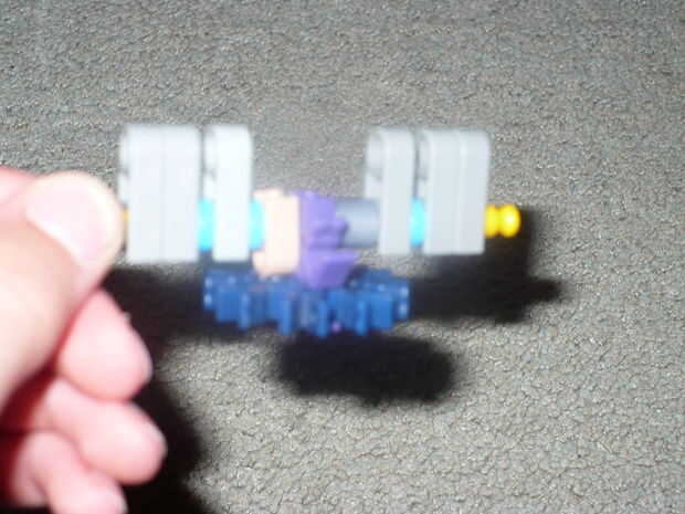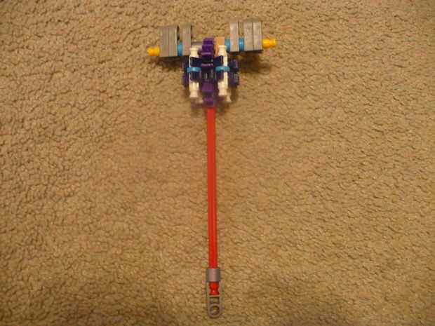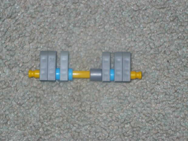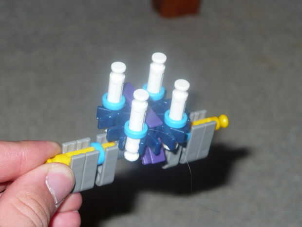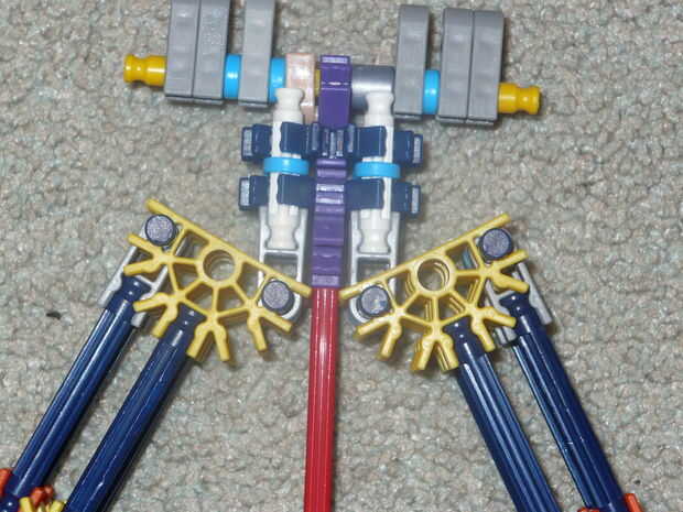 5. Ponga otra púrpura/azul Conector en el otro extremo de las barras blancas, conecte una barra roja conector morado/azul y poner un espaciador gris (equivalente a 3 discos azul, si no tienes uno) y un conector gris en el extremo de la barra roja.